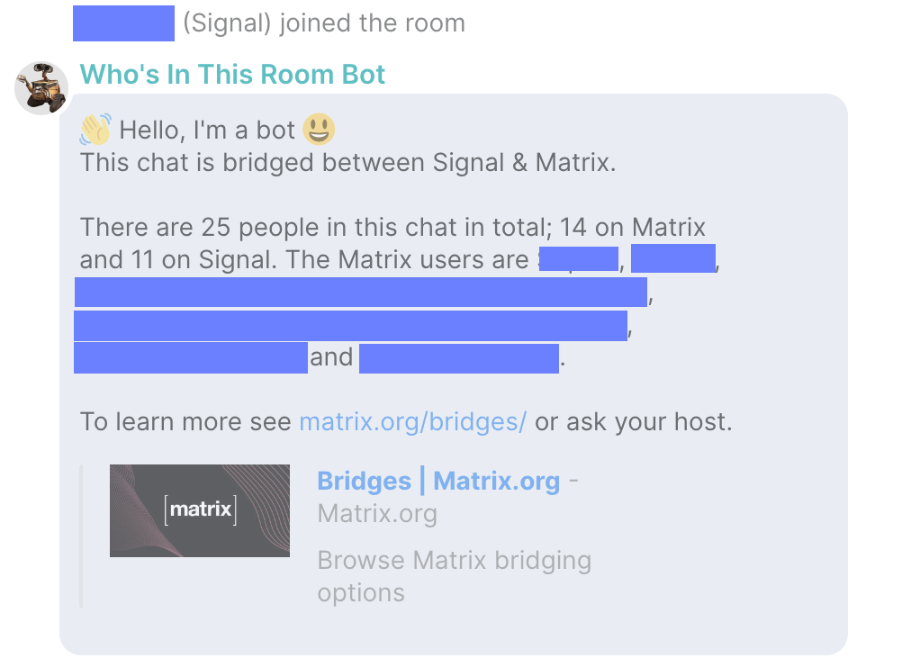 We've also been at IETF 114 to talk about MIMI - an initiative to define a standard for messaging interoperability inspired by the DMA. Matrix appears to fit perfectly into this use-case, so we've been talking with various folks involved to ensure Matrix is on the radar, including preparing our own Internet-Draft to demonstrate how it could work. MIMI is not currently a working group within the IETF, but the expectation is that it will be soon - we look forward to this happening, and are eager to contribute to the process here - or proposing Matrix itself to IETF as an initiative in its own right.