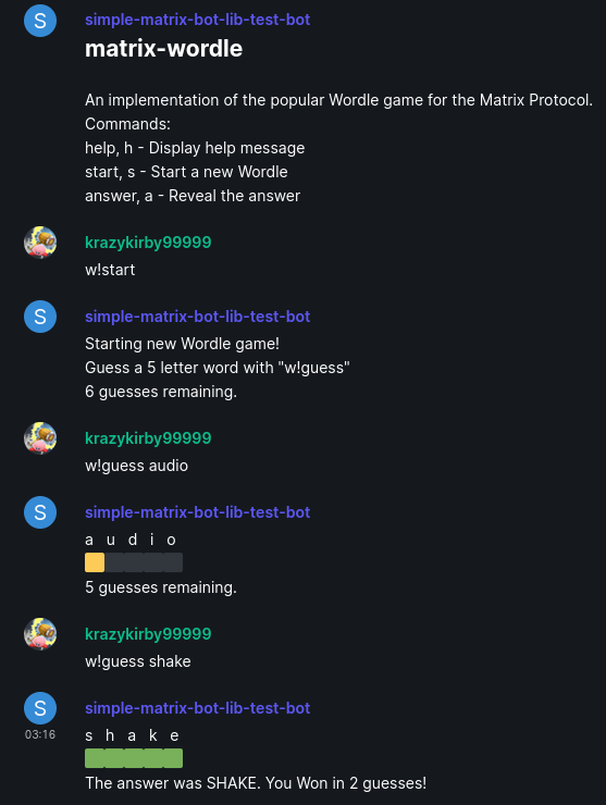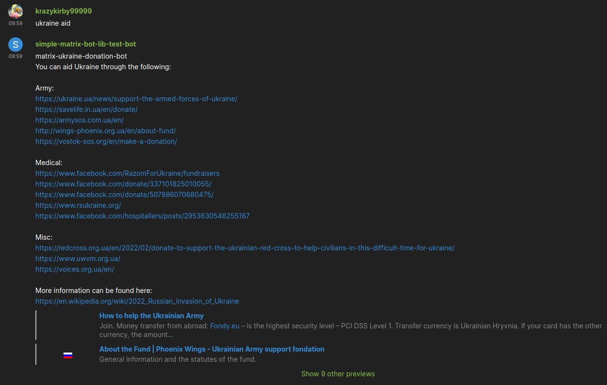 Safed Sundarata, orSundarin short, that should make it easy to get basic special functionality working. It has a lot of different functionality so you have an example code to work off of. The main motivation for this bot was to provide an!error <code>command for the developers in the ReactOS Matrix Rooms, which translates error codes to human readable text. Then of course i added other useful or fun commands to the bot. You want to read the Readme to find out more. This is the first time i ever wrote a bot, so feedback and corrections to the Source Code are highly appreciated. It is written in Go using the mautrix-go framework (thanks tulir and everyone who worked on this making it easy!). Even easier is to run and build it with go, no insane build system with broken dependencies required, which was the reason why i made it from scratch.