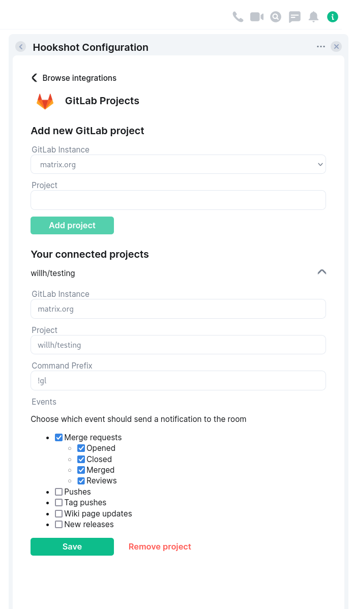 !hookshot gitlab projectcommand to configure project bridges in rooms. See the docs for instructions. (#321)- New