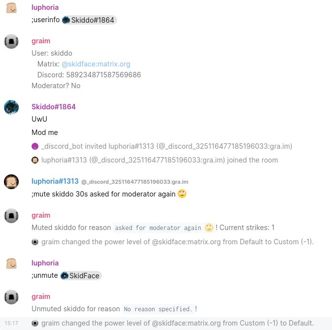 I am releasing a brand new moderation bot, graim! This bot allows you to moderate communities that are bridged with Discord via matrix-appservice-discord. You can tie a Matrix account to a Discord account, and moderate both platforms seamlessly from either end! Graim supports one Discord server and as many Matrix rooms as you want, per instance. :) You can run it yourself from the Github - https://github.com/luphoria/graim You can join the matrix space, which is bridged to the Discord server