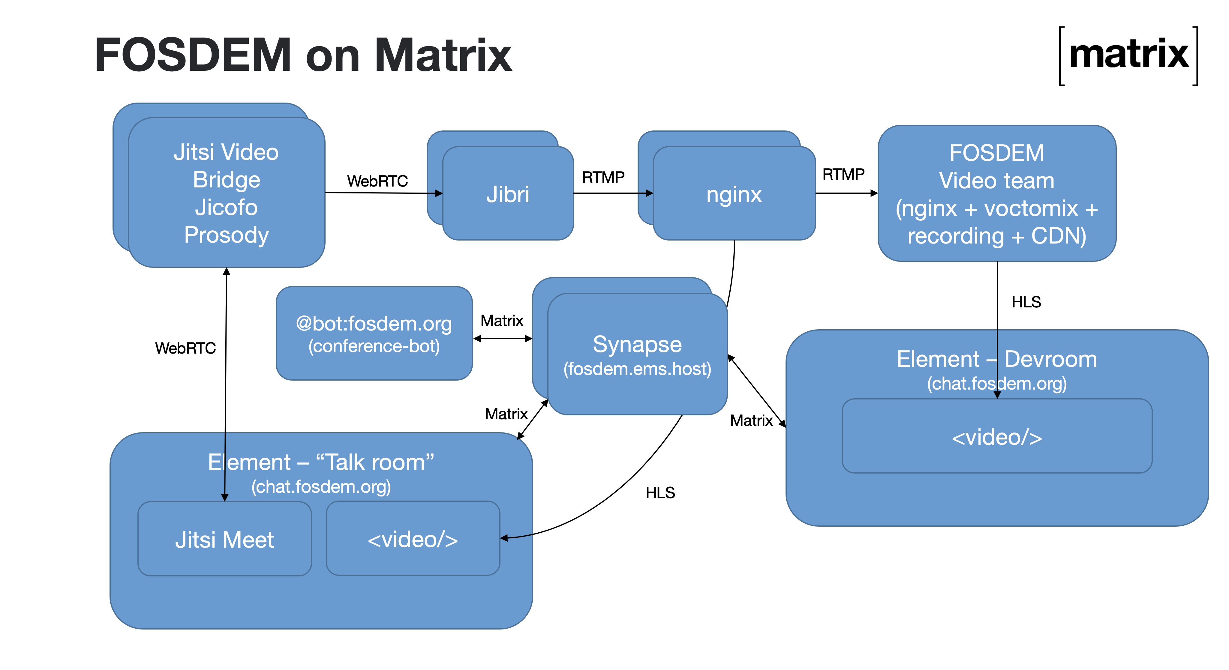 So, there you have it. We hope that this shows that it's possible to host successful large-scale conferences on Matrix using an entirely open source stack, and we hope that other events will be inspired to go online via Matrix! We should give a big shout out to HOPE, who independently trailblazed running conferences on Matrix last year and inspired us to make FOSDEM work.
