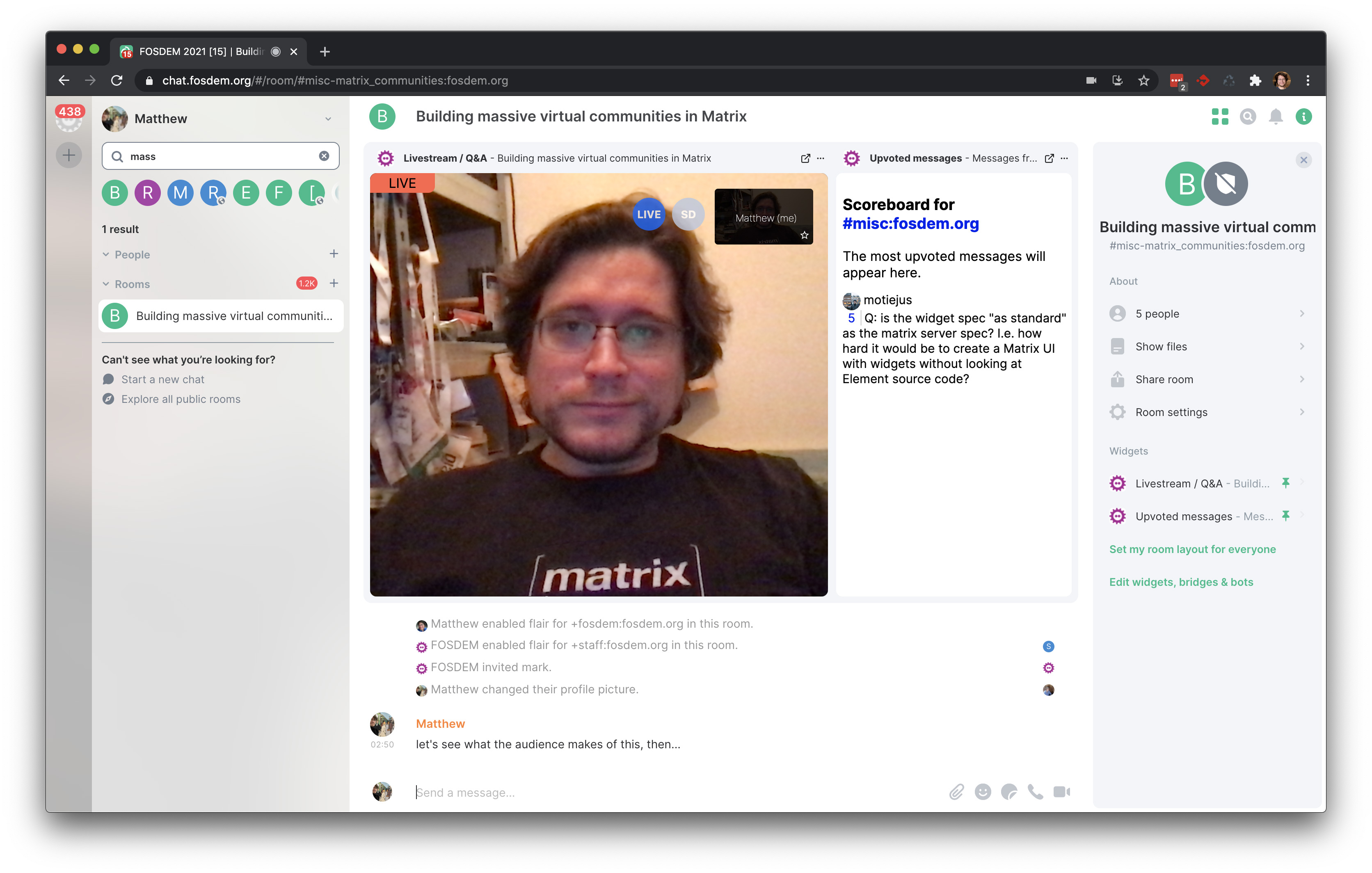 We’ve spent a lot of time improving widgets recently: these give the ability to embed arbitrary webapps into chatrooms - letting you add livestreams, video conferences, schedules, Q&A dashboards etc, augmenting a plain old chatroom into a much richer virtual experience that can hopefully capture the semantics and requirements of an event like FOSDEM.