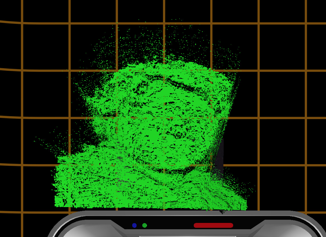 Step 5: Give up on the fancy depth encoding (for now): https://github.com/matrix-org/webrtc/commit/2f5d29352ce5d80727639991b1480f610cbdd54c. In practice, simply picking a range of the 16-bit half-precision floats to fit in the integer range [0,255] turns out to be good enough for a quick demo (i.e. 8-bit depth buffer, but over a small subset of the 16-bit depth space) - the dot cloud suddenly looked a lot more 3D and recognisable: