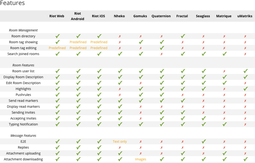 Finally, as part of a programme to improve visibility on projects in the Matrix ecosystem, we are introducing the "Matrix Clients Matrix". This is a list of some of the most popular current Matrix clients in the ecosystem today, and should shed some light on current feature statuses! The list is not exhaustive, and if you would like to see your client project included, please contact me at the same address, or come chat in the Matrix Client Developers community room. Pretty green Features grid: